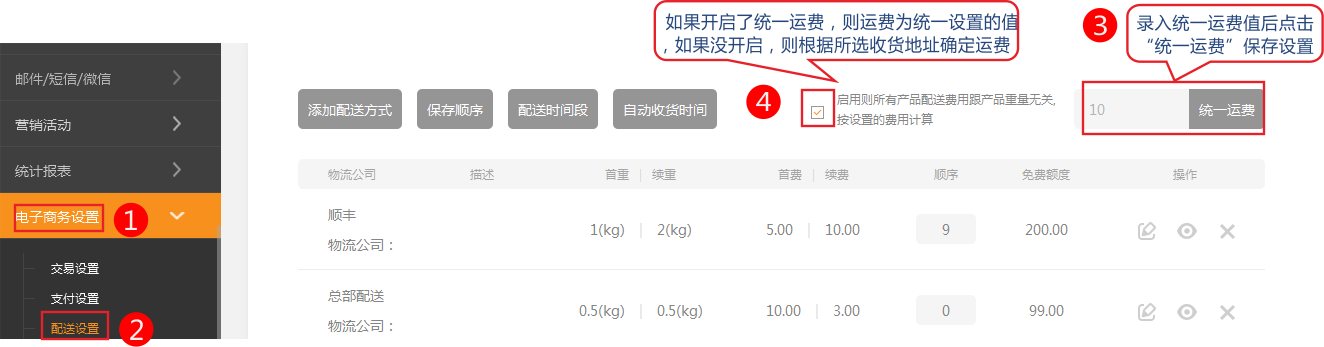 依次点击 电子商务设置-》配送设置-》勾选启用统一运费,并设置配送费用然后提交。