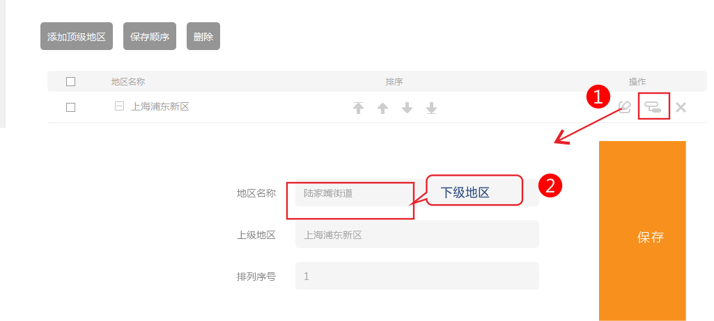保存后,在列表中点击添加二级地区
