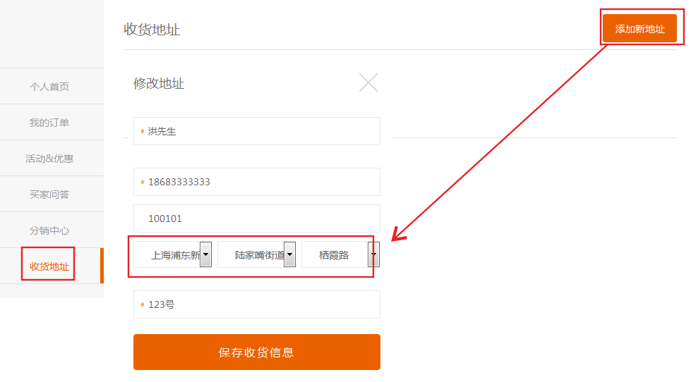修改本人收货地址为自定义地区
