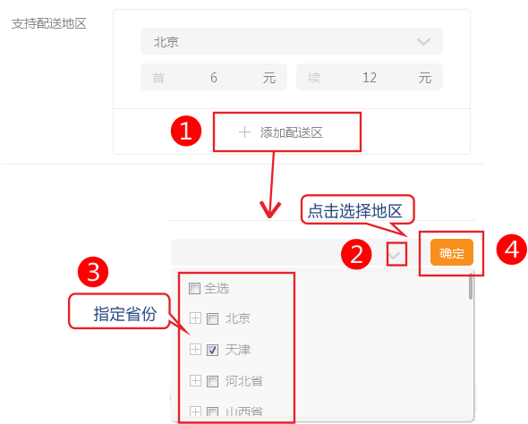 添加新配送方式然后选择 指定地区和费用本市专用:选择河北省,并设置费