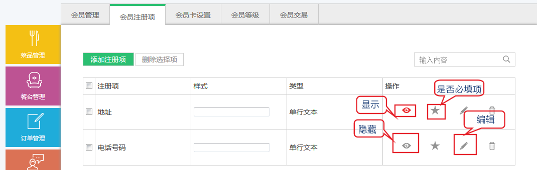 如果想让某个注册项在会员中心显示,点击变为红色眼睛图标就可以了;不显示就点击变为灰色眼睛图标。