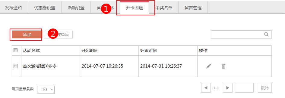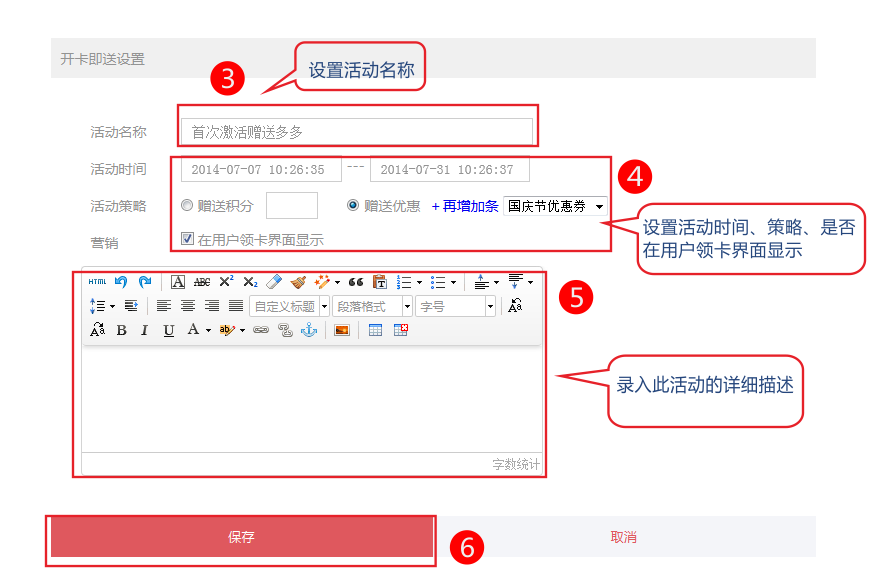 2、设置活动名称、时间、赠送策略、是否在用户领卡界面显示,即可生成一个完整的开卡即送活动。