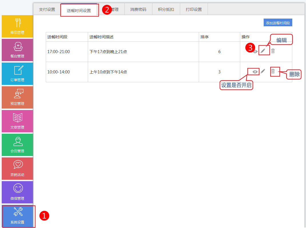 1.依次点击系统设置-》送餐时间设置 添加您需要的时间段